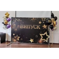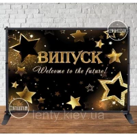 Баннер на выпускной 3х2м “Випуск. Welcome to - Фотозона (виниловый) (Без каркаса) - Черный фон, золотые звезды
