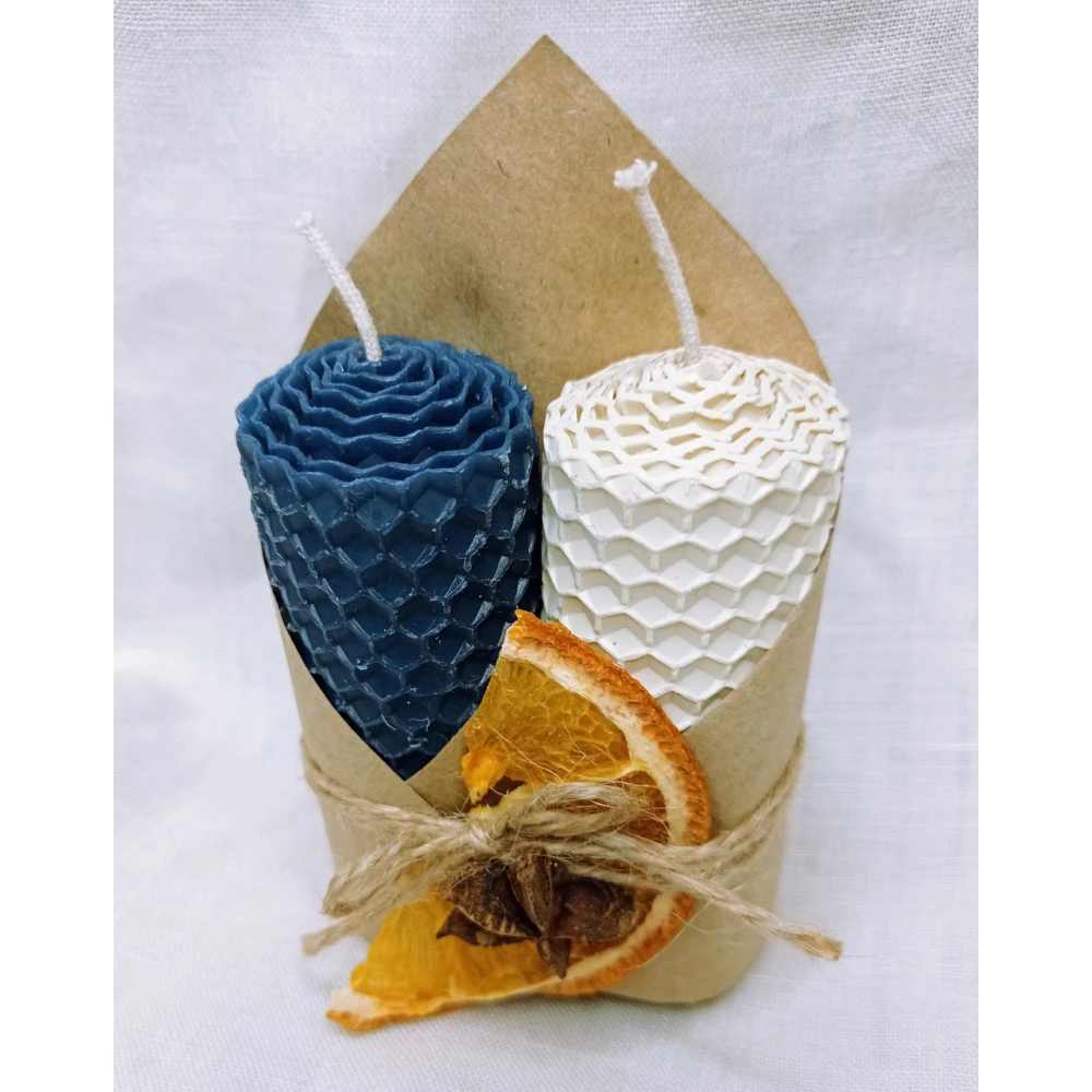 Набор свечей из вощины с декором ( ручная работа) 2 шт (высота 8 см диаметр 3 см) Синий и Молочный