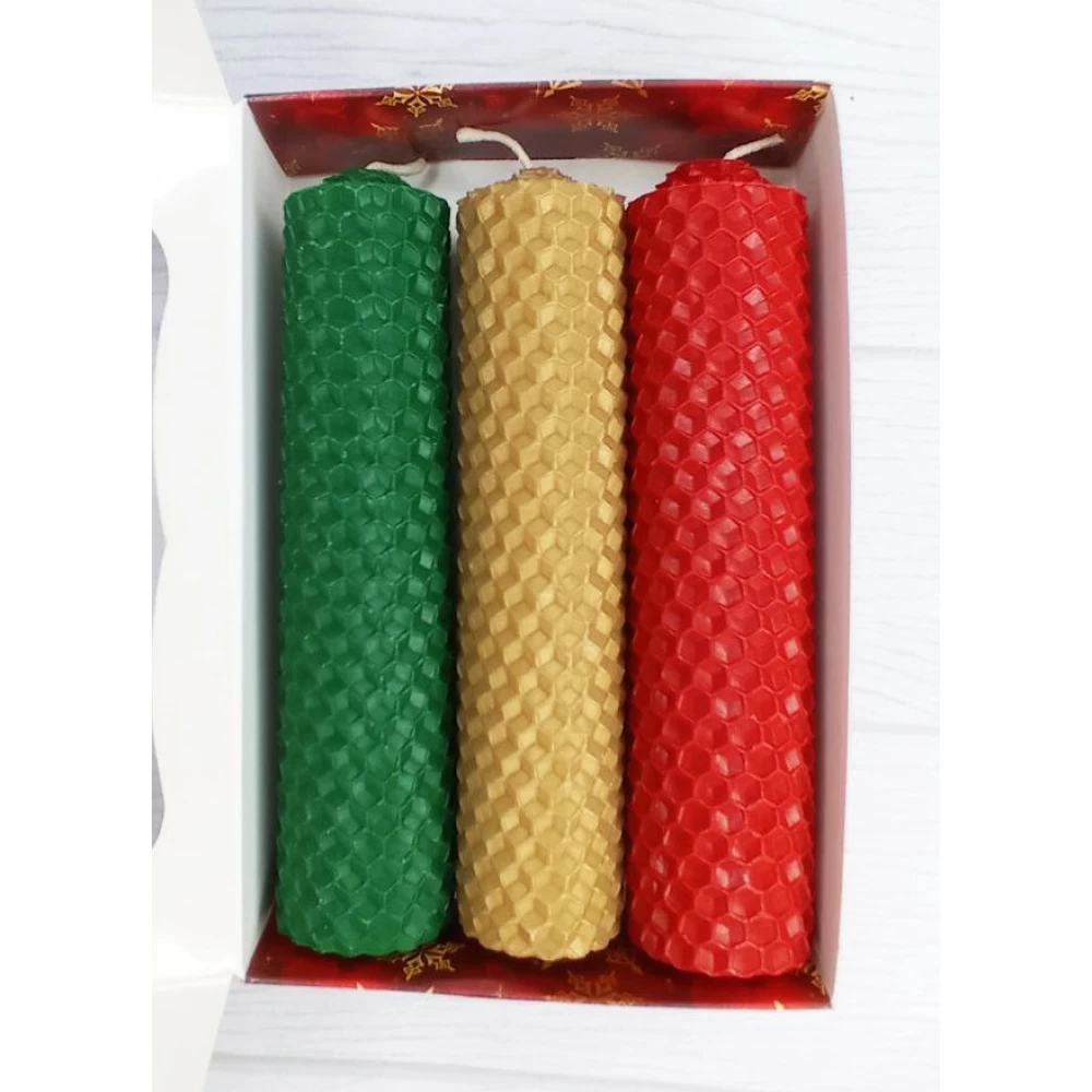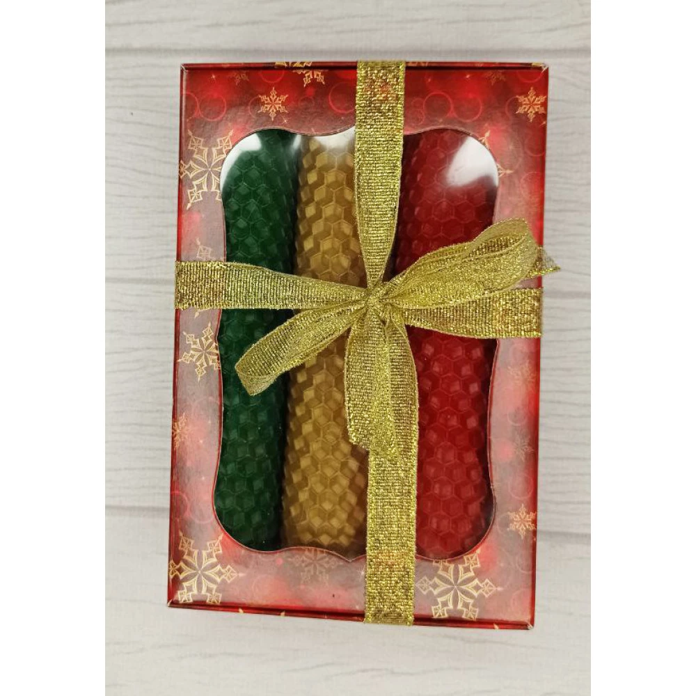 Набор Новогодних свечей из вощины 3 шт 13 см (Зеленый цвет, золотой, красный) ( ручная работа)