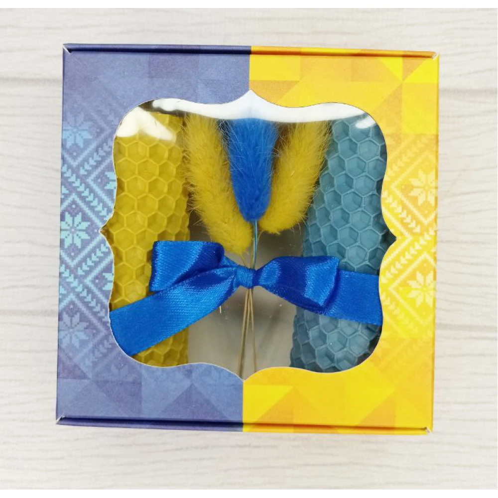 Патриотический Набор свечей из вощины 2 шт 8 см с букетом из сухоцветов (Голубой желтый) ( ручная работа)