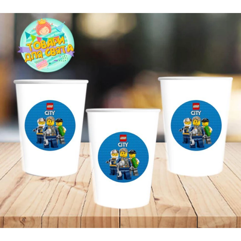 Стаканчики “Лего сити“ белые бумажные с круглой наклейкой (поштучно) одноразовые