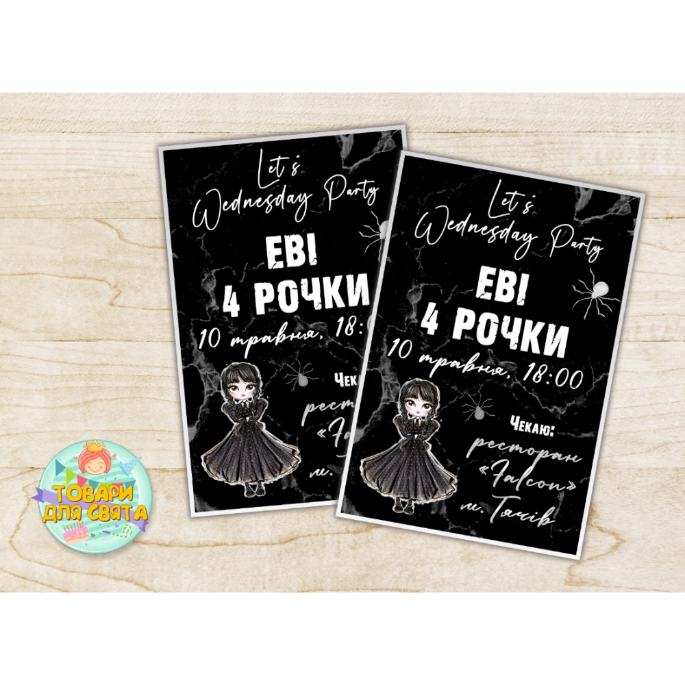 Именные пригласительные “Венсдей / Уенсдей / венздей“ тематические (полиграфия) - в черно-серебряном цвете
