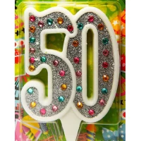 Свеча в торт на юбилей Серебро + стразы с белой окантовкой - 50